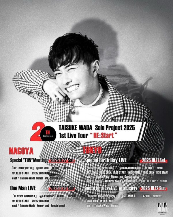 TAISUKE WADA Solo Project 2025 9/27(土)Special“FUN”Meeting「39″Thank you”39」の1部・2部共にSpecial GuestとしてTAKAの出演が決定いたしました!